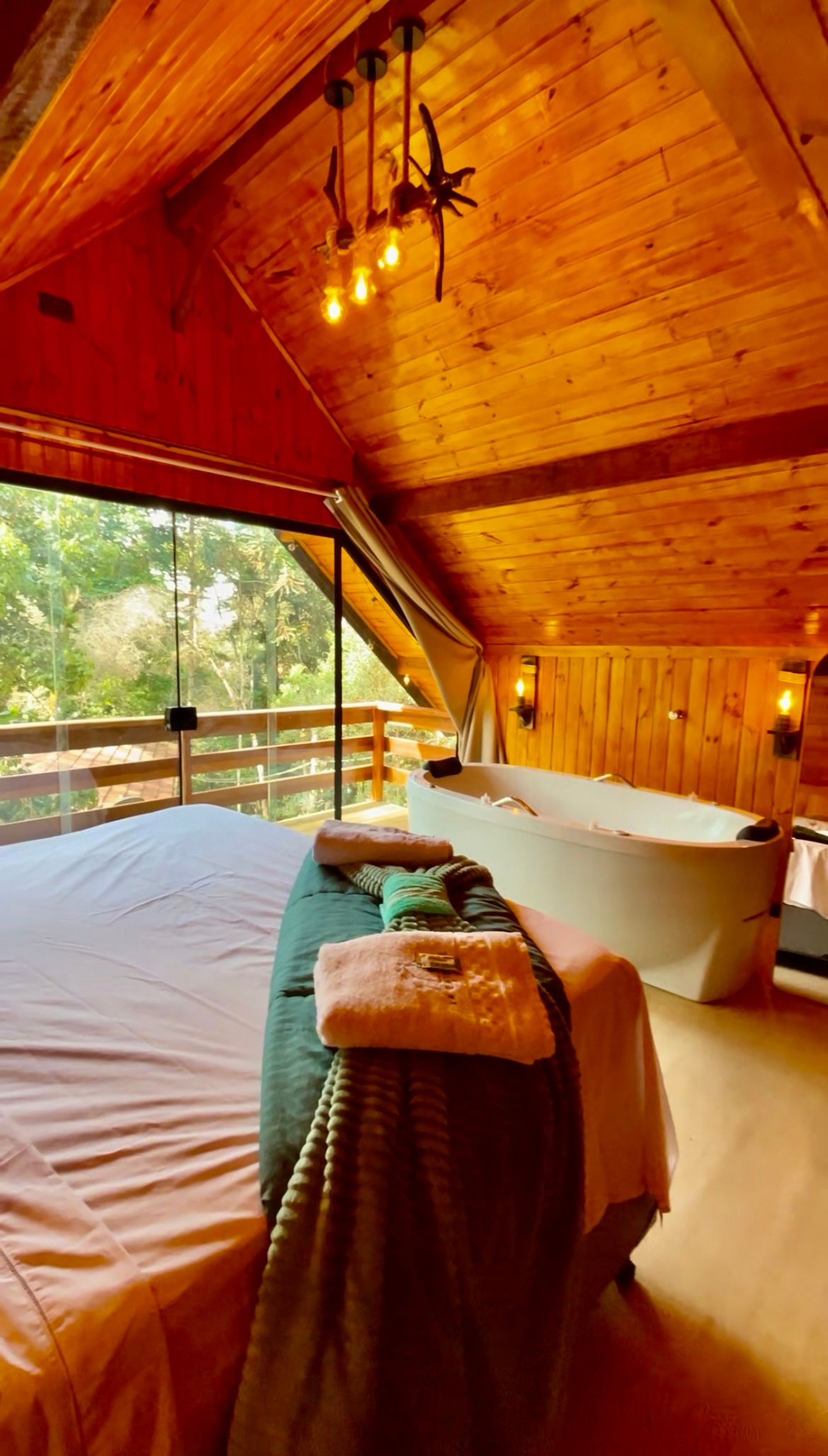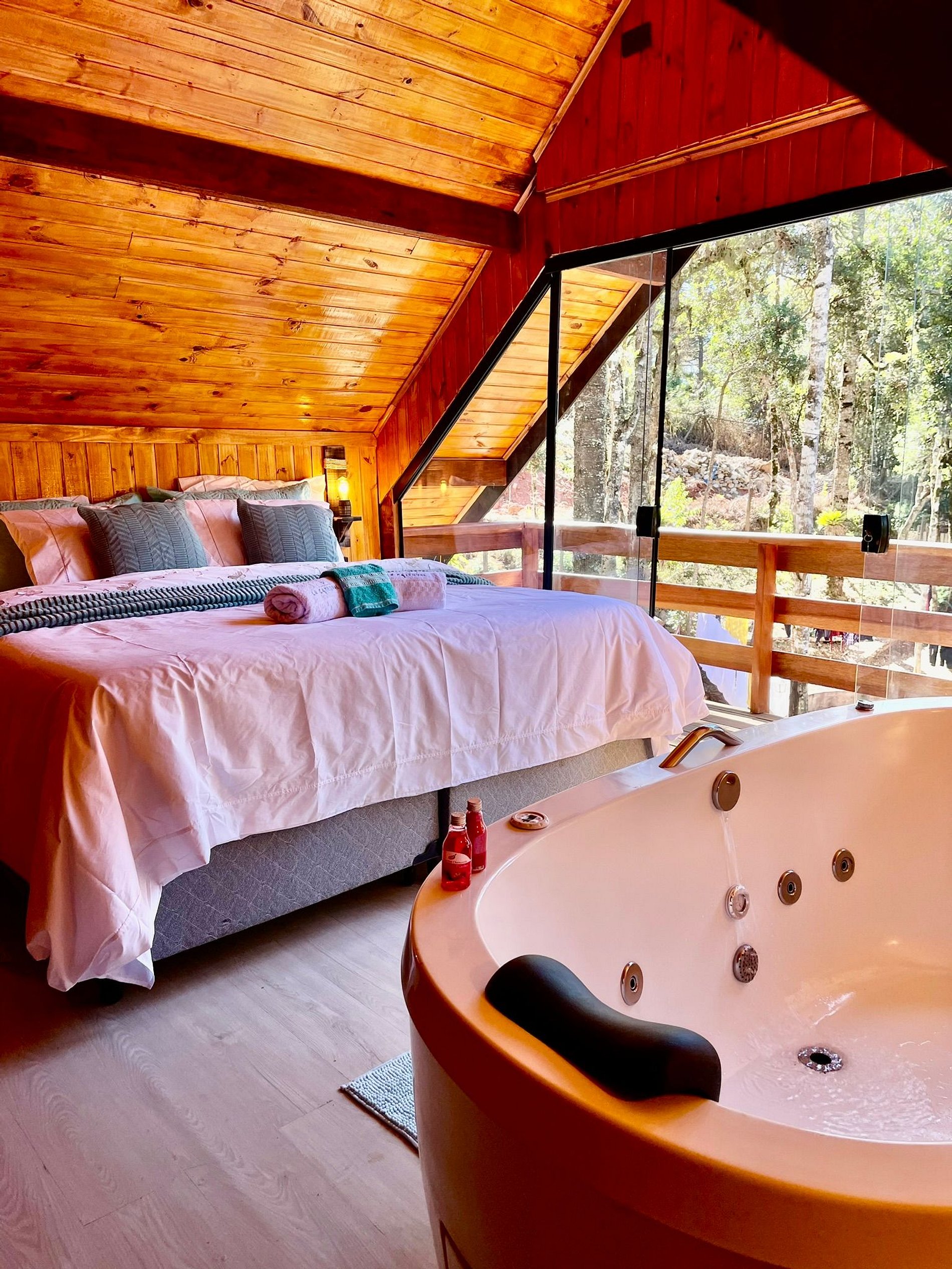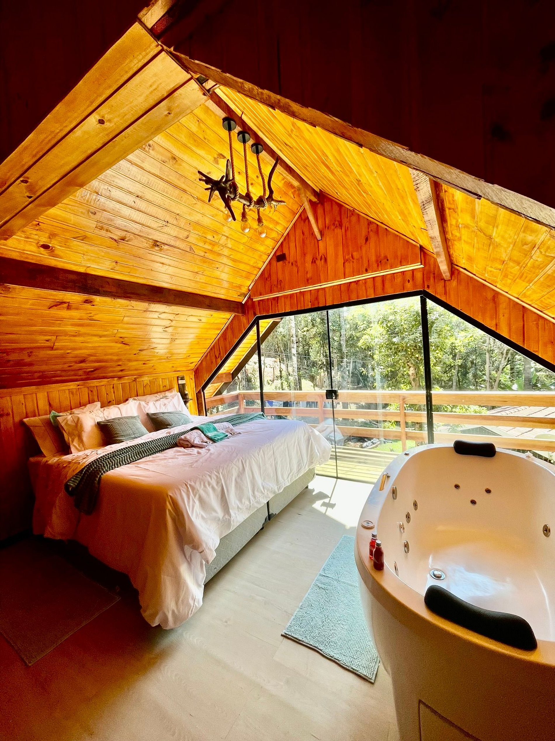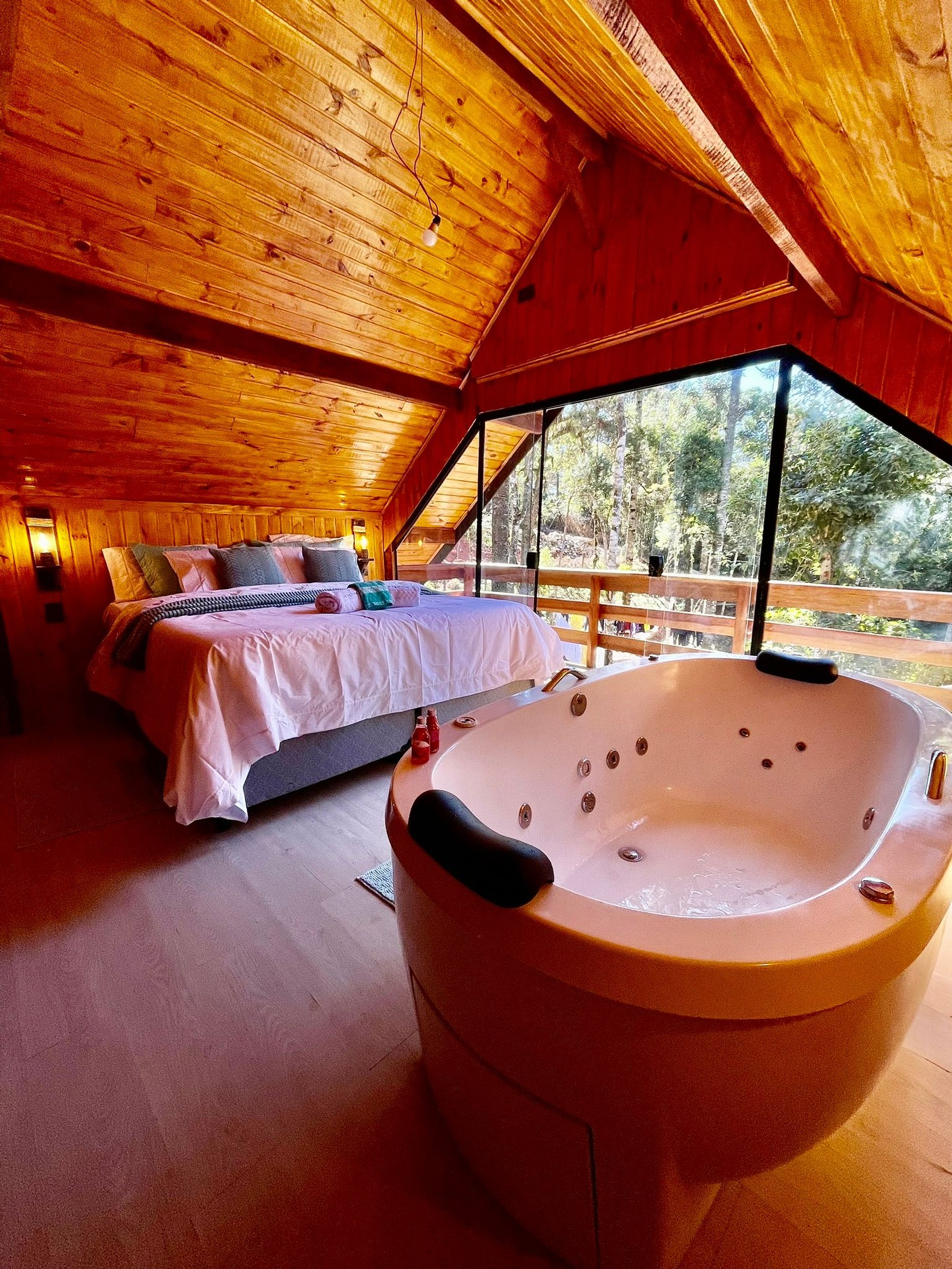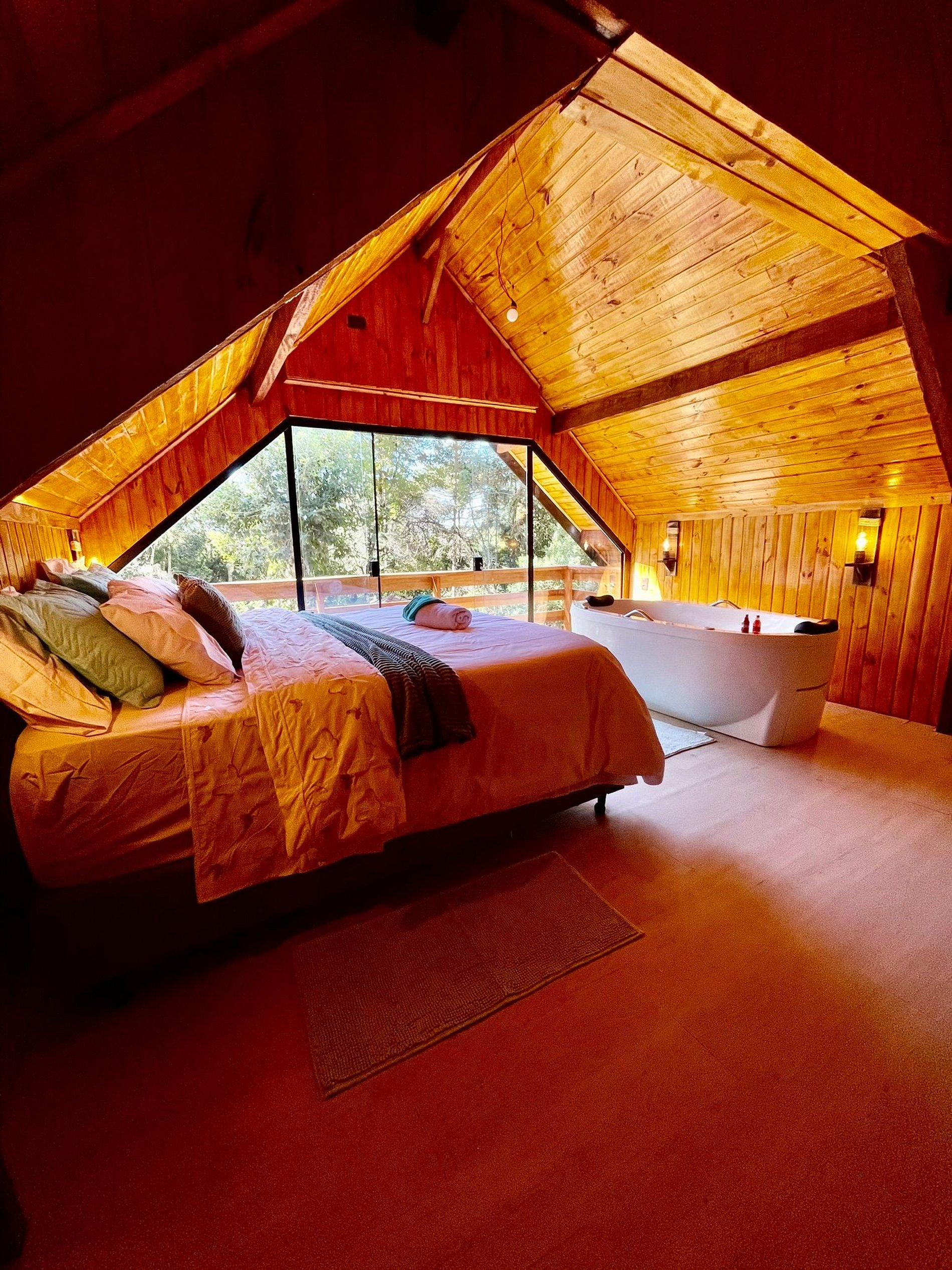 Imagine-se entrando em um chalé de madeira rústico, cuidadosamente decorado para criar uma atmosfera acolhedora e elegante. Repleto de detalhes pensados no seu conforto, o chalé oferece uma banheira de hidromassagem com cromoterapia – perfeita para relaxar após um dia de passeios –, cozinha completa para preparar suas refeições favoritas e dois ambientes espaçosos para garantir o melhor aproveitamento do espaço. O fogo de chão externo é um dos nossos maiores atrativos, ideal para curtir um bom vinho sob o céu estrelado de Campos do Jordão.